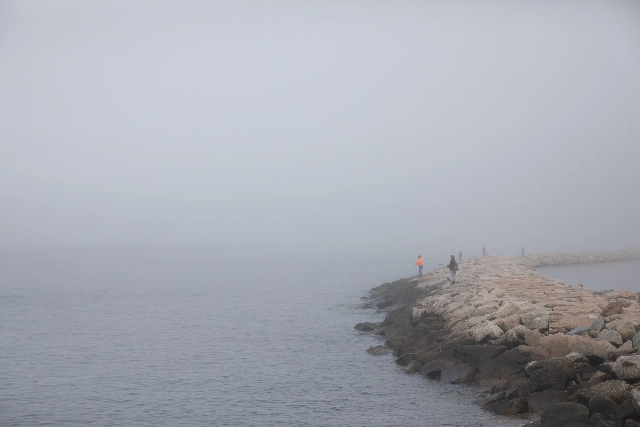 - Wide - shot of two talent walking to and standing at edge of Jetty/Pier rocks